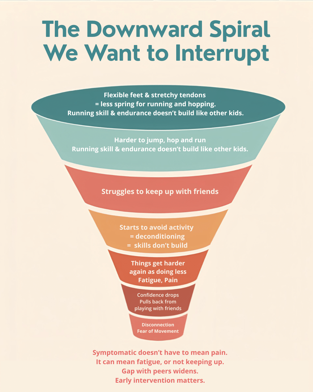 Many of the kids we see follow a pattern that builds on itself. It starts with the biomechanics: flexible tendons and lots of ankle movement means less spring for running and hopping. A few hops is fine. But repetitive, sustained tasks fatigue quickly because every push-off costs more energy. So running, because it is hard, doesn’t build fitness the way it does for other kids. They struggle to keep up with friends. Sport becomes less fun. They pull back. And the cycle deepens.
