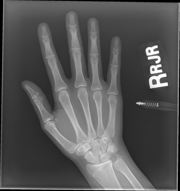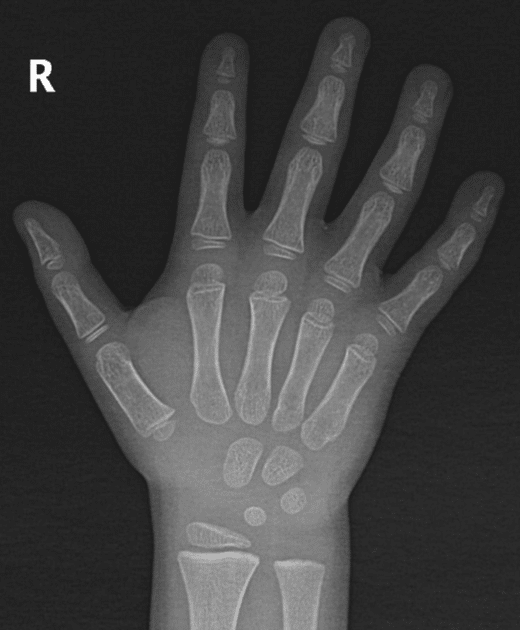Caption: Left: Hand x-ray, age 4. Right: Hand x-ray, age 14. Notice how many wrist bones are still forming at age 4. This is why screening is not meaningful before around age 5.