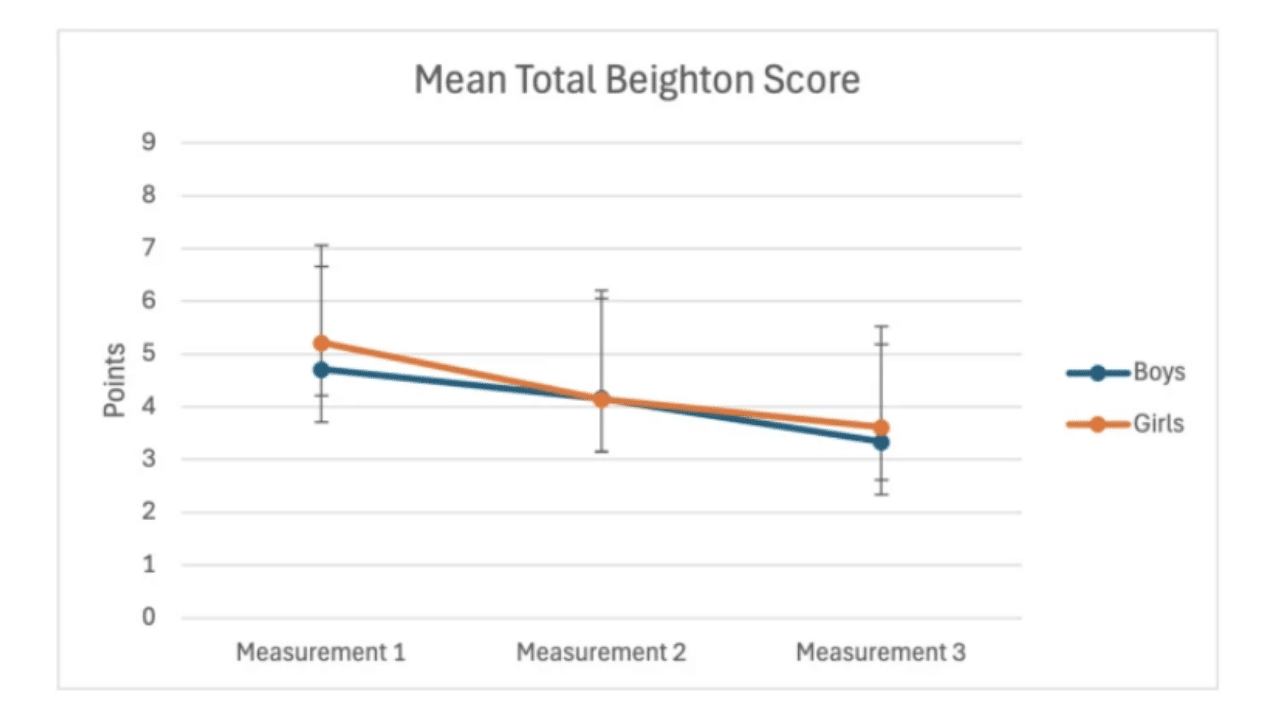 Beighton score graph fromshowing mean total Beighton score decreasing over three measurement points for boys and girls